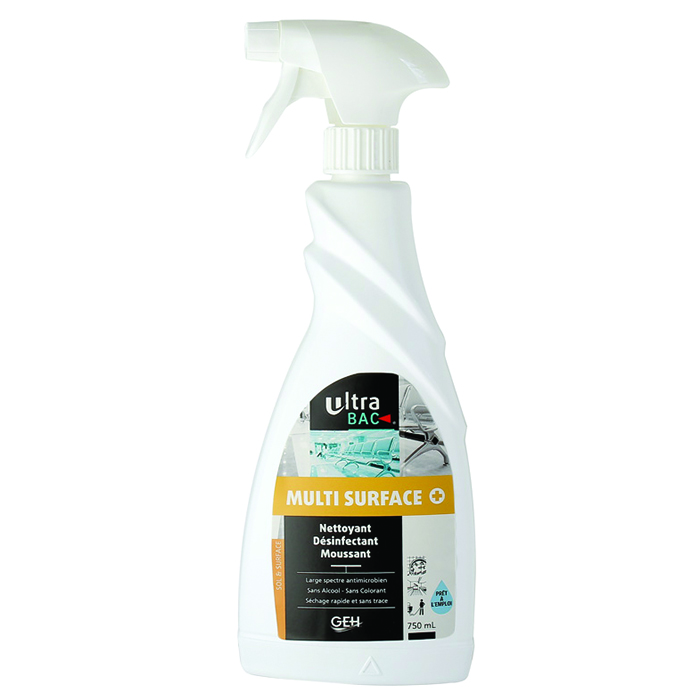 Le Multisurfaces Surf+ de la marque GEH est un spray nettoyant et désinfectant, avec une action bactéricide, fongicide et virucide. Il est ainsi destiné au nettoyage et à la désinfection des surfaces tels que les paillasses, les plans de travail, le mobilier, les tables à langer, les murs, les bureaux, les poignées de porte, etc… Il peut donc être utilisé sur tout type de surfaces en toute sécurité. De plus, il est sans alcool, sans colorant et permet d’agir sur un très large spectre microbien. Séchage rapide et sans laisser de traces sur les surfaces traitées.