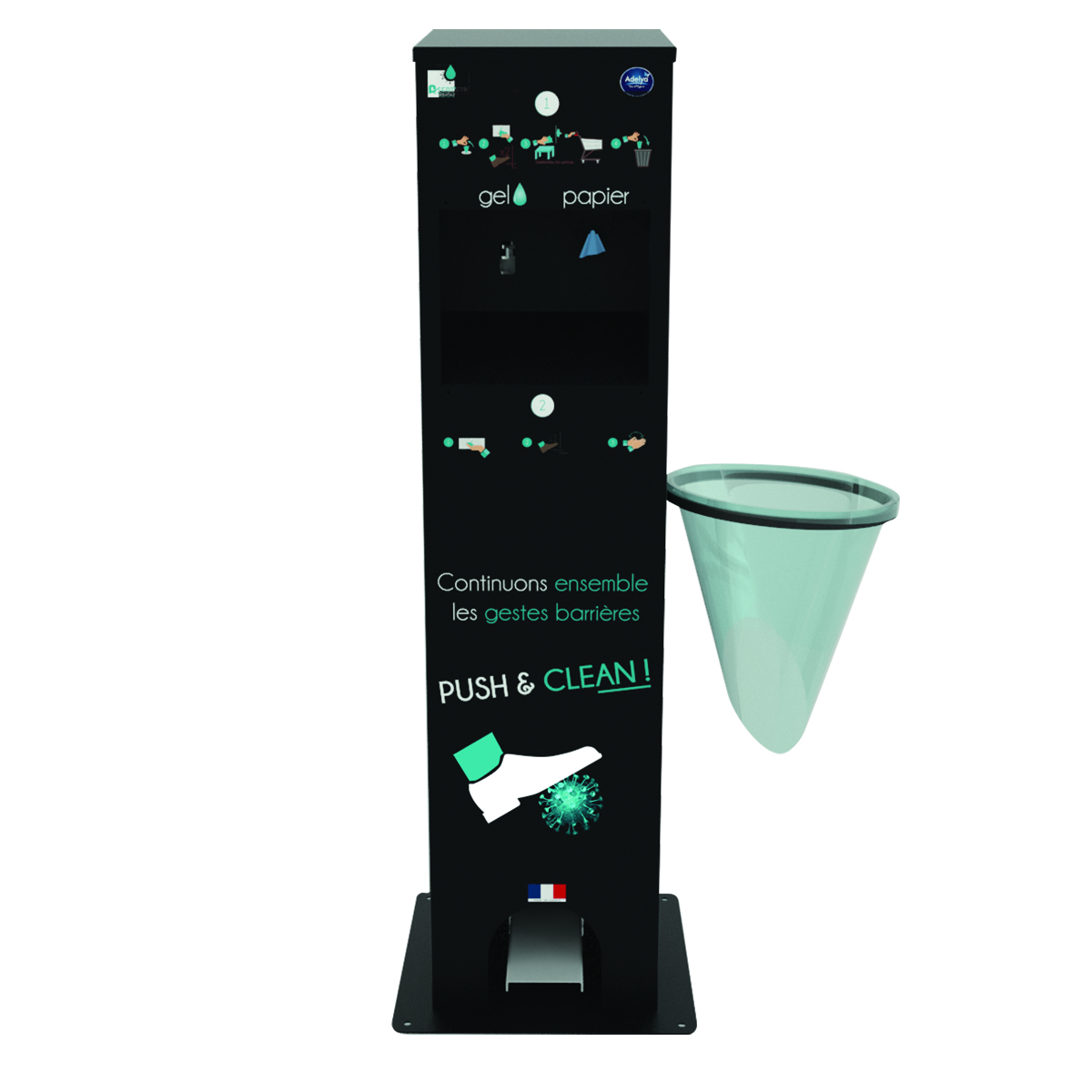 Totem de désinfection mains et surfaces avec poubelle intégrée contenant un système de distribution de papier à dévidage central permettant l’imprégnation de gel hydroalcoolique.